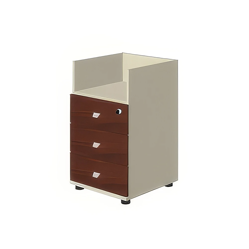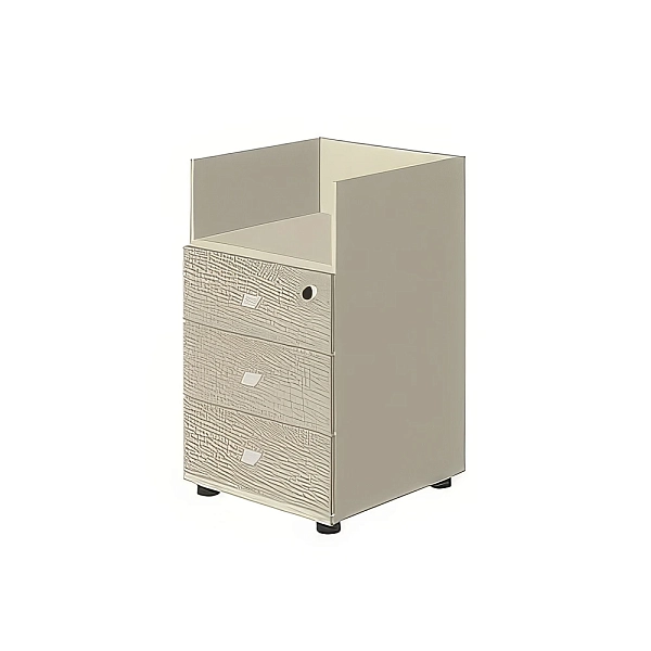 Тумба имеет открытую нишу высотой не менее 170 мм и внутреннее отделение с тремя выдвижными ящиками, установленными на роликовые направляющие серого цвета. Лицевая фурнитура – металлическая, тип «скоба», цвет «хром матовый», длина не менее 55 мм (межцентровое расстояние 32 мм). Ящики тумбы снабжены врезным центральным замком.