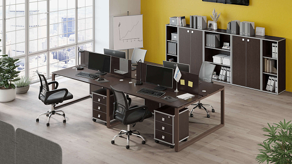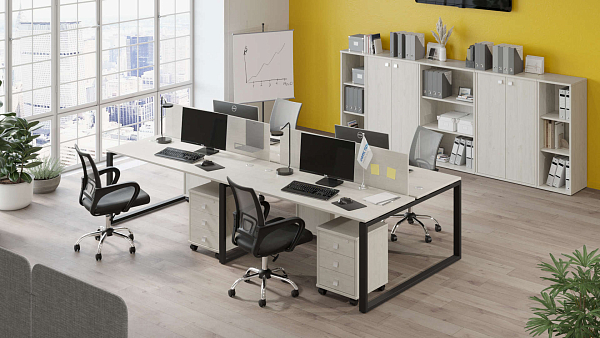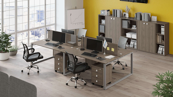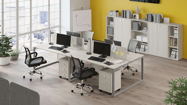 Комплект мебели для работы 4ех человек. Состав: БО.СМ-4.3, Б.ЭКР-3 (2 шт.), Л.ТМ-3 (4 шт.), Л.СТ-2.3 (2 шт.), Л.СТ-2, Л.СУ-2 (2 шт.)