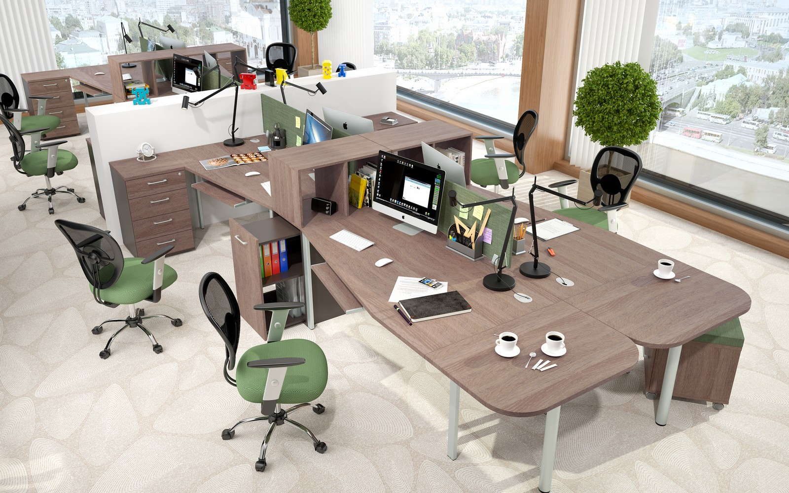 Низкие тумбы с мягкими накладками прекрасно объединяют в себе систему хранения и временное рабочее место для посетителей, не занимая при этом ни одного лишнего миллиметра офисной площади. А перегородки, обтянутые тканью, не только приглушают звук, делая фоновый шум менее заметным, но и служат прекрасным «продолжением рабочего стола», сохраняя напоминания о неотложных делах своего владельца.