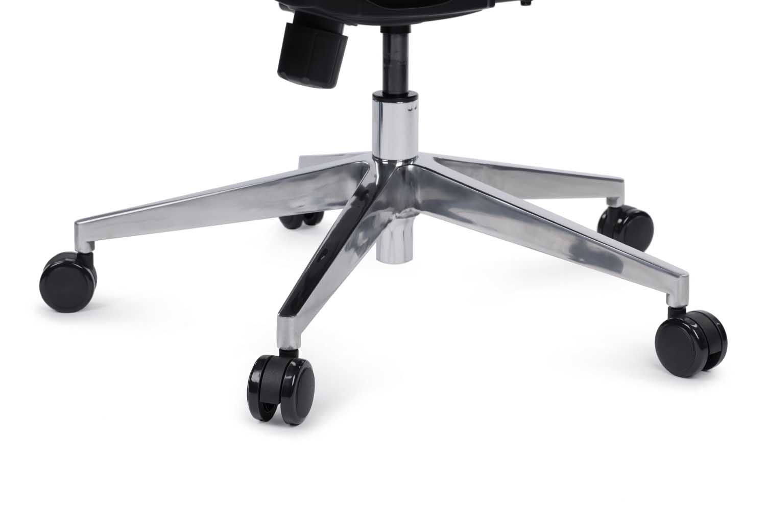 Основание кресла выполнено из прочного металла (диаметр 700 мм), а не из пластика. Это обеспечивает высокую устойчивость, надежность и позволяет выдерживать максимальную нагрузку до 250 кг. Также производитель использует мягкие полиуретановые ролики, которые подходят для любых типов напольных покрытий (паркет, ламинат, ковролин), не оставляя царапин и обеспечивая плавное перемещение.