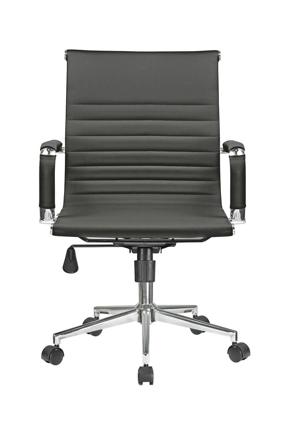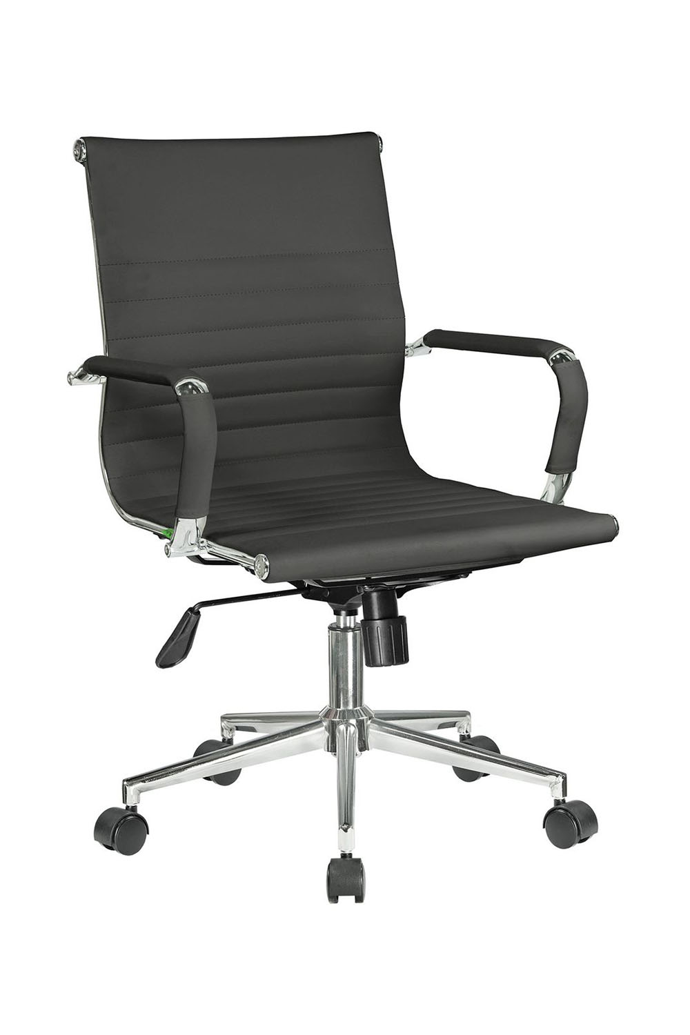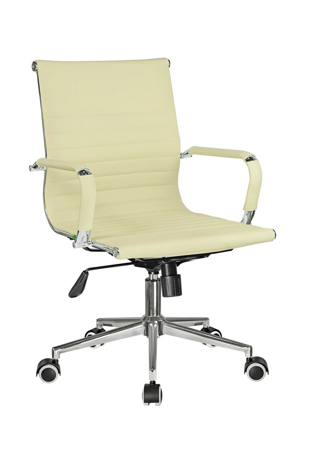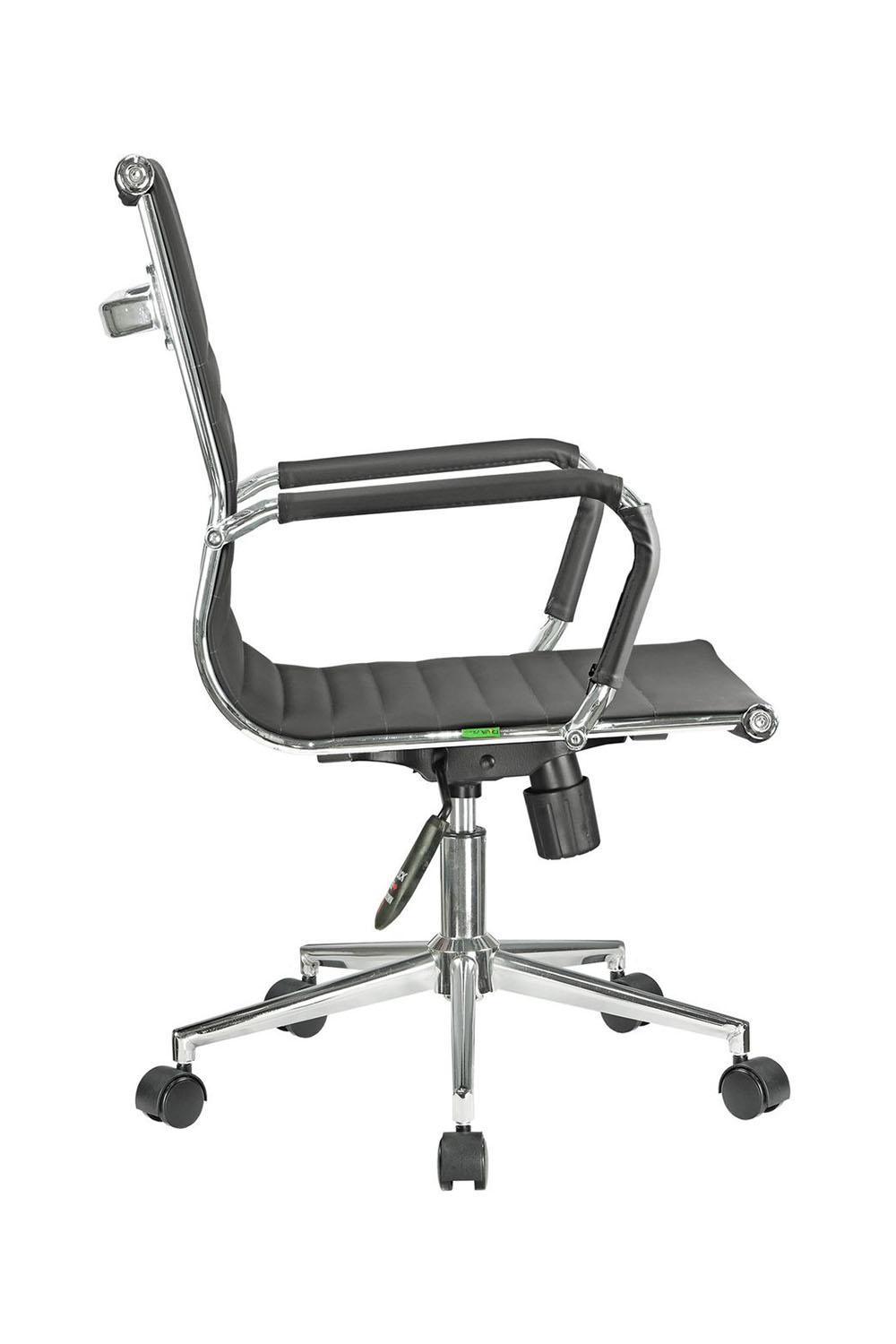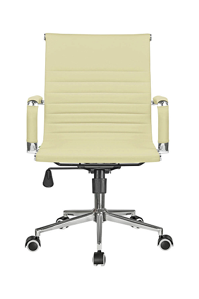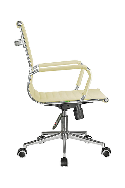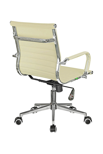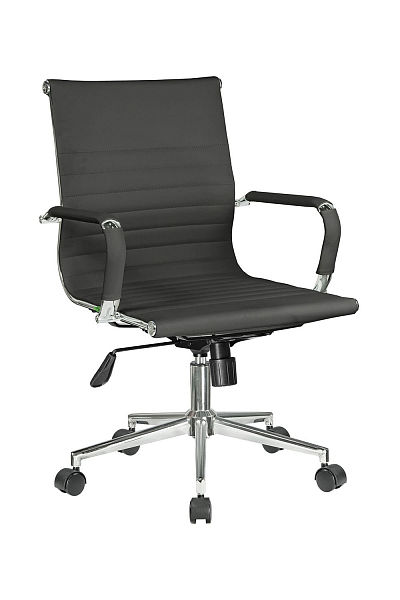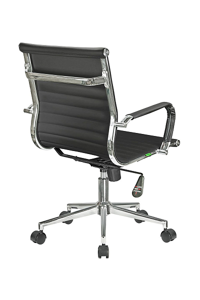Основание кресла выполнено из хромированного металла, пятилучье оснащается колесиками, что облегчает перемещение изделия, исключает повреждение пола. Модель способна выдержать нагрузку в 120 кг. Современный дизайн, использование экокожи в качестве материала обивки позволяет устанавливать кресло в интерьере любого стиля.